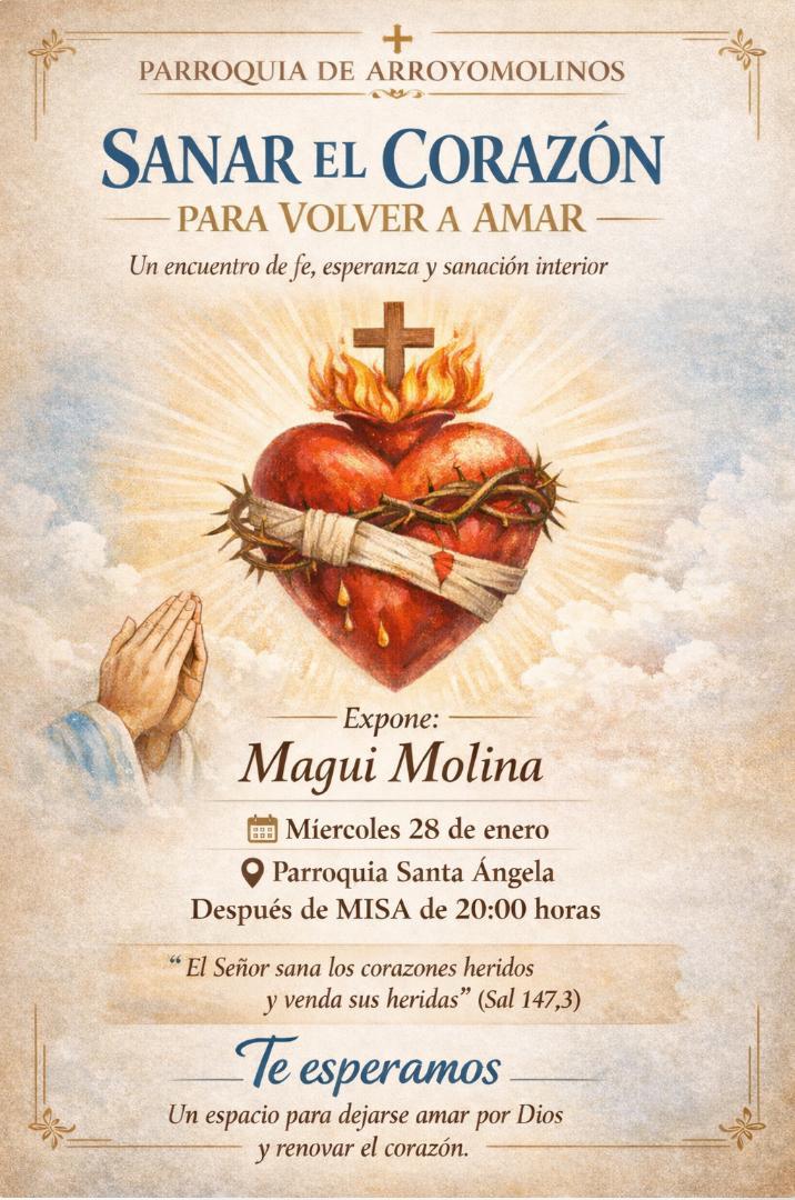 Buenas tardes a todos, feliz III Domingo del Tiempo ordinario, y feliz fiesta de nuestra patrona, la Virgen de la Paz. Os dejamos los avisos de esta semana: - Mañana, domingo 25, por ser la fiesta de la patrona, solo habrá dos misas. La misa mayor será a las 11:30 h en la Asunción, con procesión posterior, y la misa por la tarde, a las 20 h, en Santa Ángela. La misa de las 11:30 h será, además, la despedida del P. Juan Cerrato. - El miércoles 27 en Santa Ángela, después de la Misa de las 20 h, tendremos una charla sobre la sanación del corazón, a cargo de Magui Molina, intercesora católica. - Aún quedan plazas para el retiro de kerigma del próximo fin de semana. Apúntate en el formulario que está más arriba. - El último fin de semana de enero, tenemos el II Retiro Kerigma de la parroquia. Las plazas son limitadas. Adjuntamos el cartel y el formulario de inscripción. |